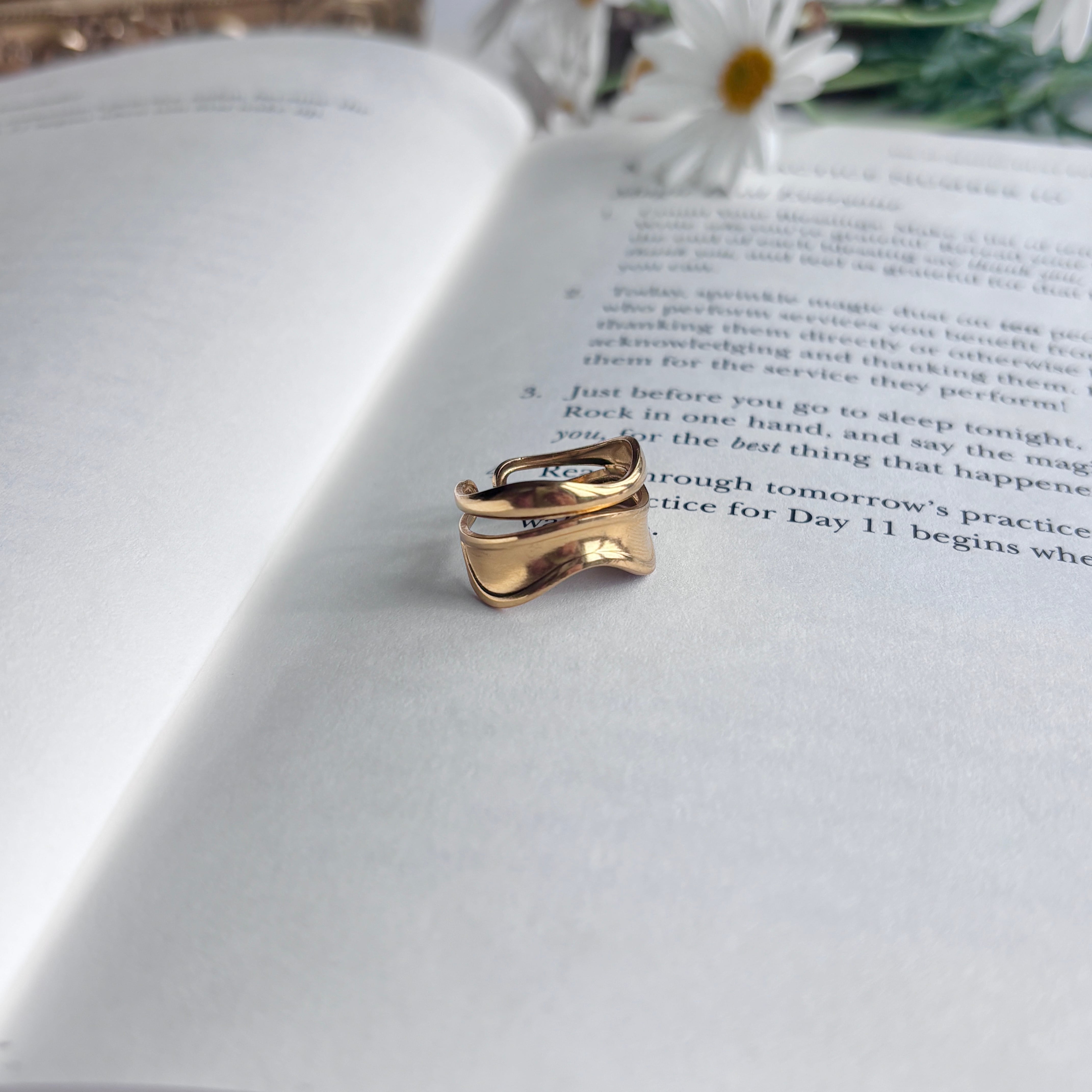 - 波のような曲線が描く、しなやかな美しさ。指を細く、長く見せてくれるワイドなシルエットは、どんな仕草もエレガントに。